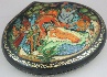 Beautiful detail accentuates this vivid scene from Palekh artist Trofimova. The scene is very dynamic compared to early Palekh artwork which relied more heavily on the iconographic style. The rolling hills, sprawling city and even the flying Chernomor make this composition very alive.Painted by Trofimova of Palekh.